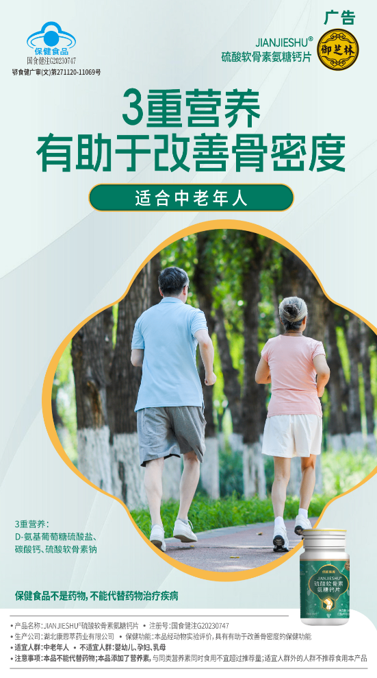 本品以D-氨基葡萄糖盐酸盐、碳酸钙、硫酸软骨素钠为主要原料制成的保健食品,具有有助于改善骨密度的保健功能。