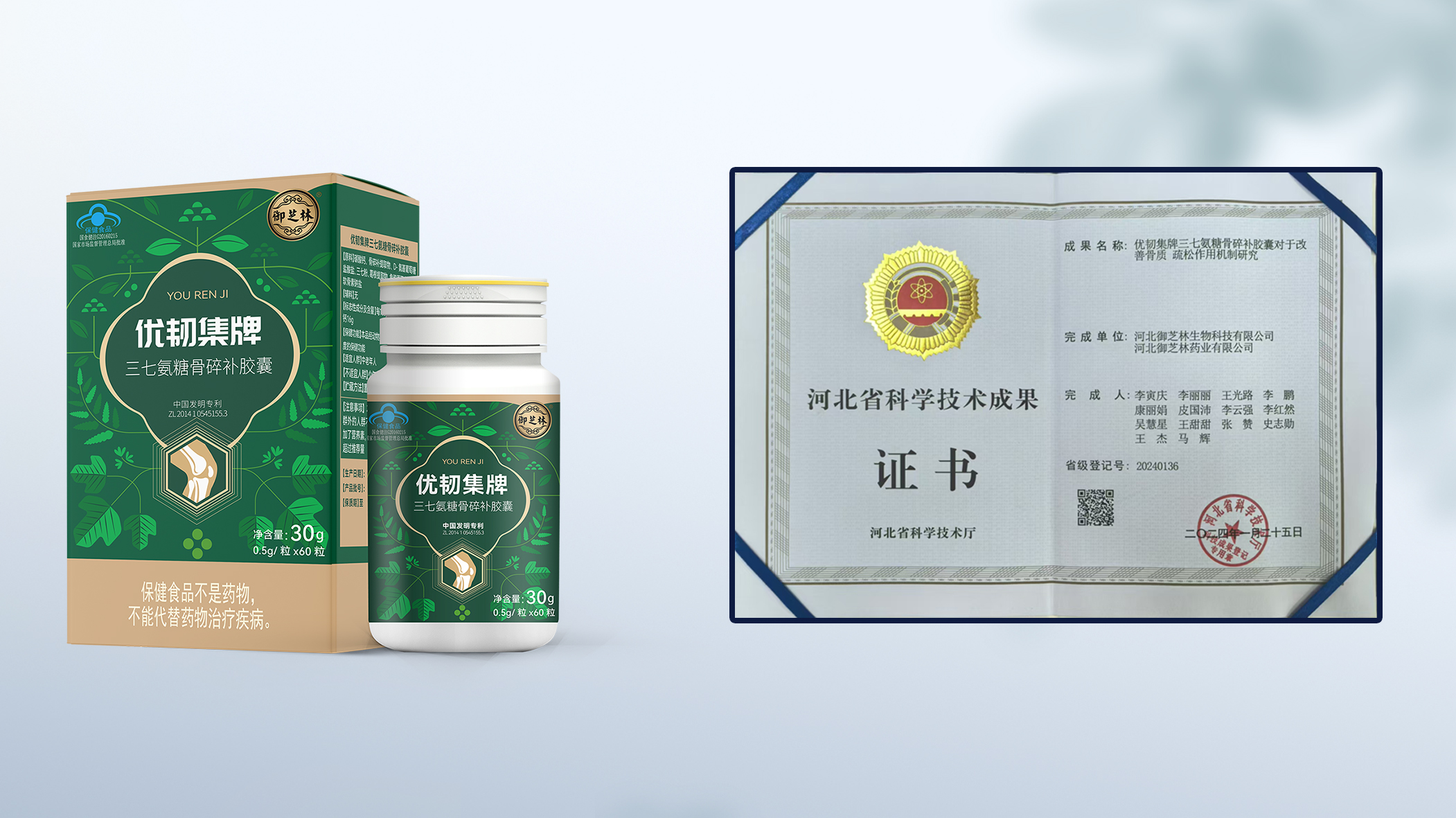 以御芝林骨健康领域明星产品”优韧集三七氨糖骨碎补胶囊“(以下简称为“优韧集”)为例,研发团队针对中老人骨组织血液循环特点与骨营养流失情况,创新采用“3+4”科学组方:以3味药食同源原料(三七、葛根、骨碎补)改善骨关节微循环,促进骨骼对营养物质的吸收;同时,4味骨骼营养素(钙、氨糖、鱼胶原蛋白、硫酸软骨素)来满足骨骼对骨营养物质的需求。从“促吸收”与“补营养”两个维度协同作用。